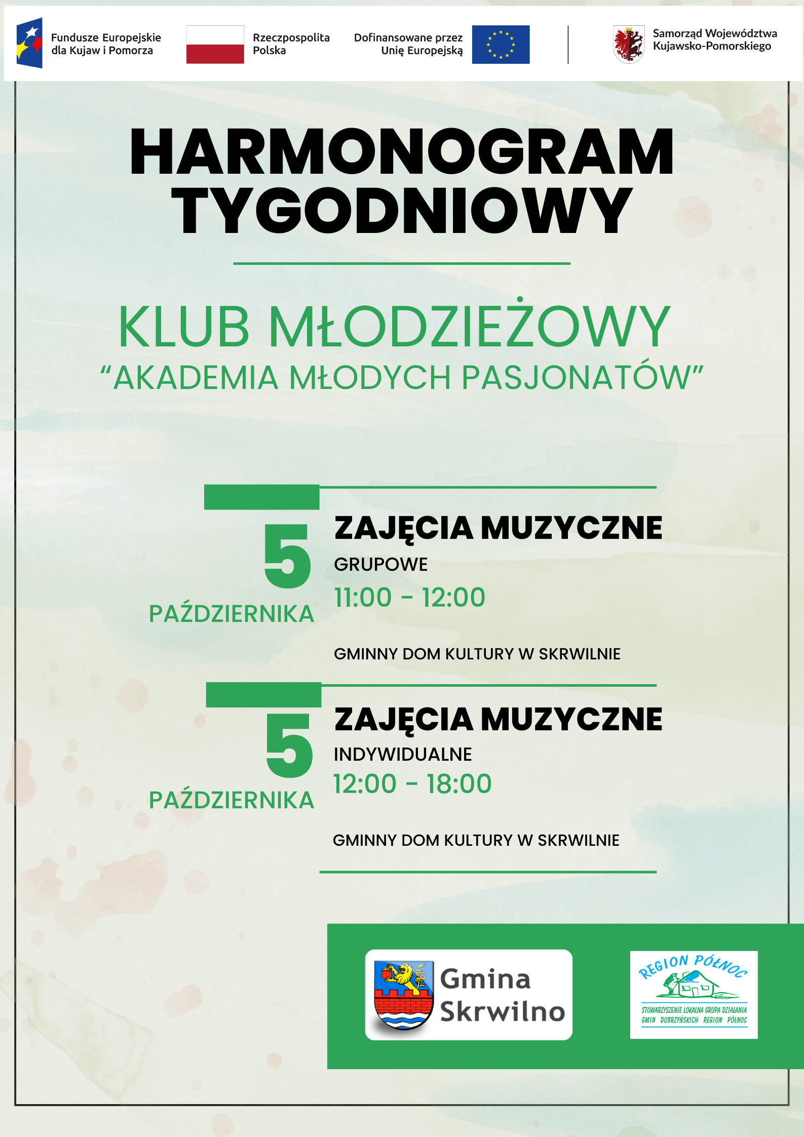 Informujemy, że 24 września br. zakończony został nabór do projektu pn. Klub młodzieżowy „Akademia Młodych Pasjonatów”, realizowanego przez Gminę Skrwilno. Do udziału w projekcie zakwalifikowało się 12 młodych uczestników, którzy już od października rozpoczną swoją…